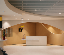 Roelandt Interieurbouw realiseerde het maatmeubilair en wandbekleding van het restaurant en het businesscentrum (+- 5000 m²) van het EY-hoofdkantoor te Diegem - The Wings.