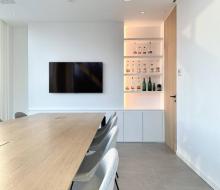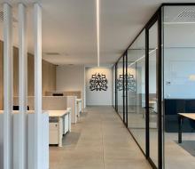 Als je de eerste verdieping betreed, waar de kantoren, vergaderzaal en open eet- en ontvangstruimtes zich bevinden, valt het wapenschild van Ordal in de centrale doorgang op. De ledlijn die in het plafond werd verwerkt legt hie rong extra nadruk op.